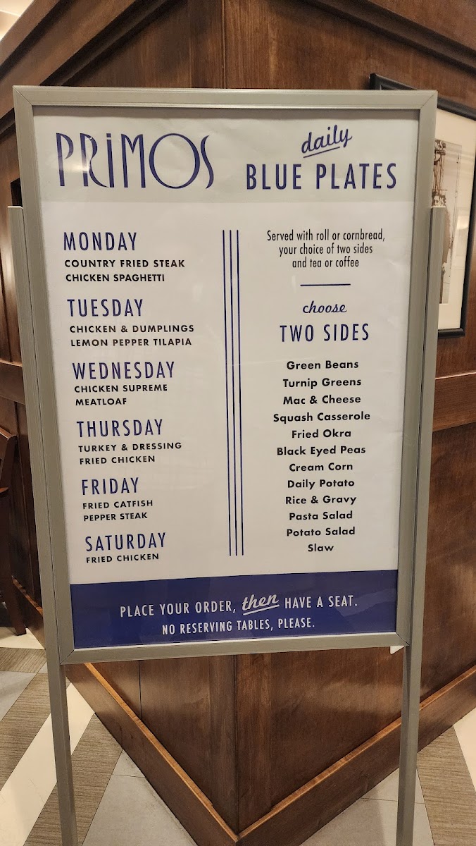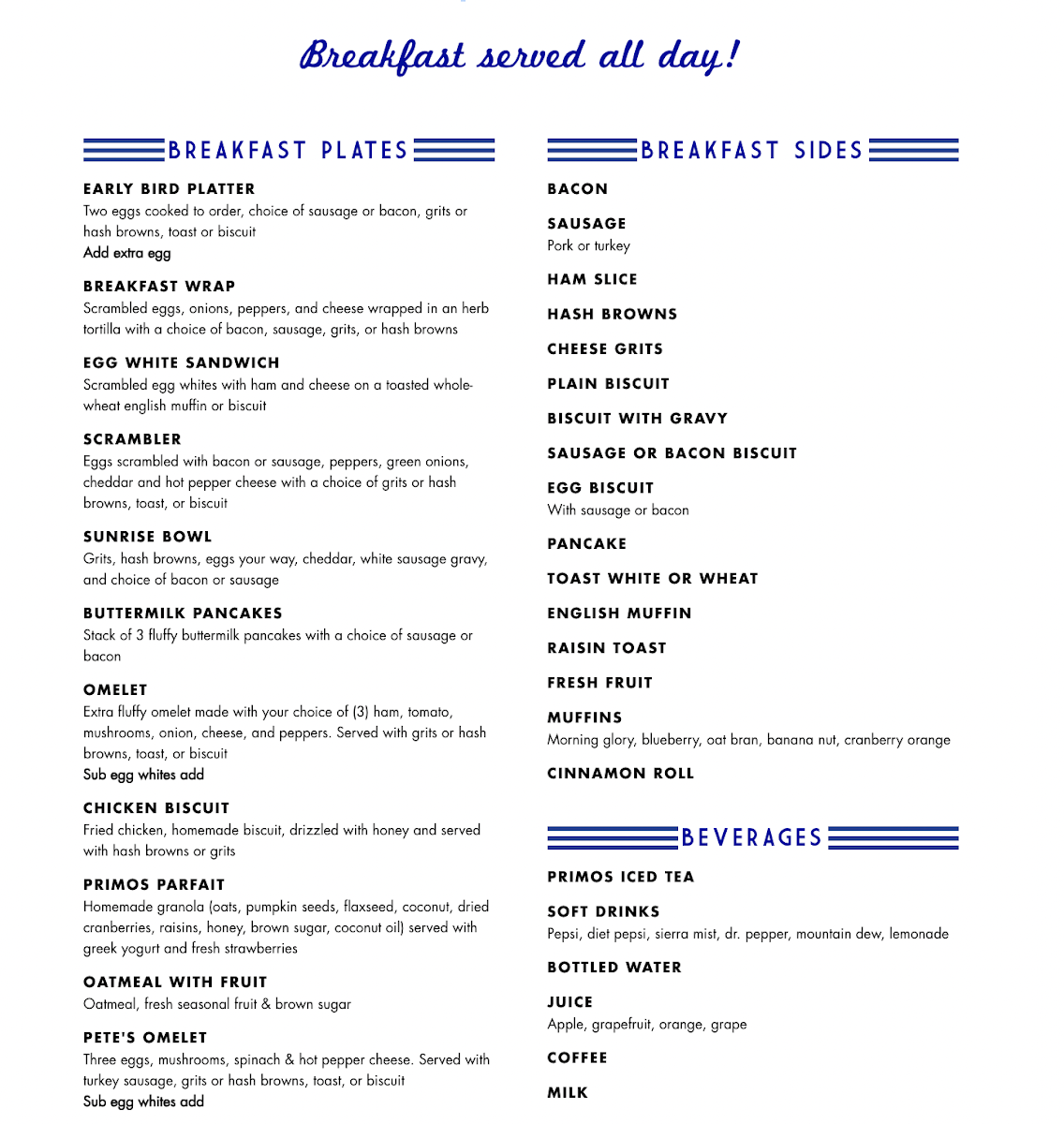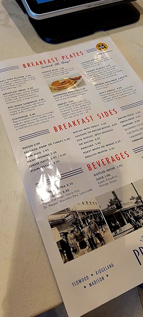 Primos Cafe is a charming diner located in Madison, MS, that delights with its hearty, all-day breakfast menu and comforting Southern classics. The breakfast plates, such as the Early Bird Platter and the flavorful Scrambler loaded with bacon, sausage, peppers, and cheese, stand out for their generous portions and homestyle flair. Health-conscious diners will appreciate the Egg White Sandwich, served on a toasted whole wheat English muffin or biscuit. Beyond breakfast, Primos serves satisfying daily specials like turkey and dressing or fried chicken, accompanied by fresh sides like vegetable soup, seafood gumbo, and creamy potato salad. The wholesome desserts and unlimited coffee complete the experience, creating a welcoming environment for casual meals. Though some dishes arrive cooler than ideal, the overall quality and affordability make Primos Cafe a dependable spot for classic, comforting fare with a Southern touch.