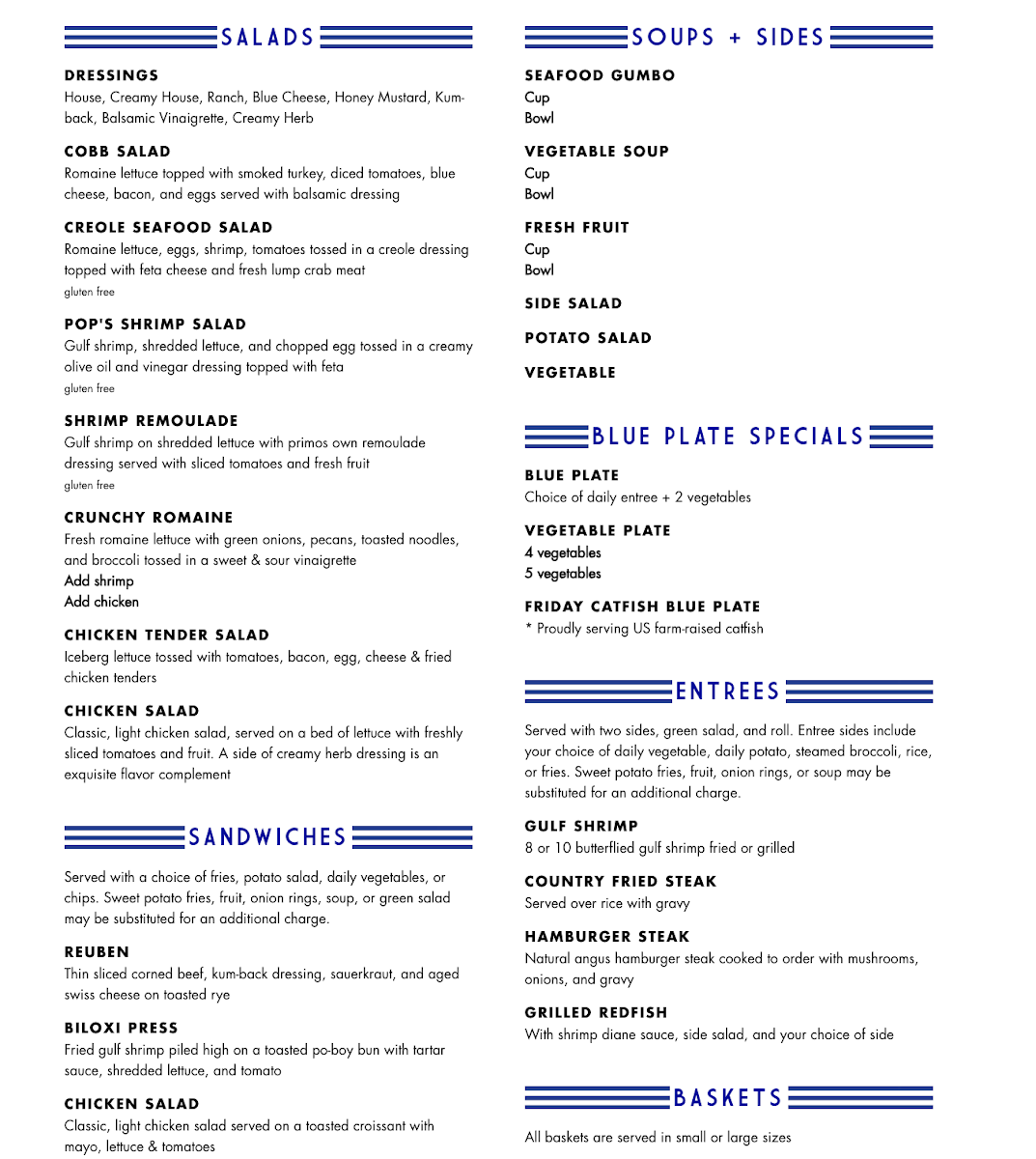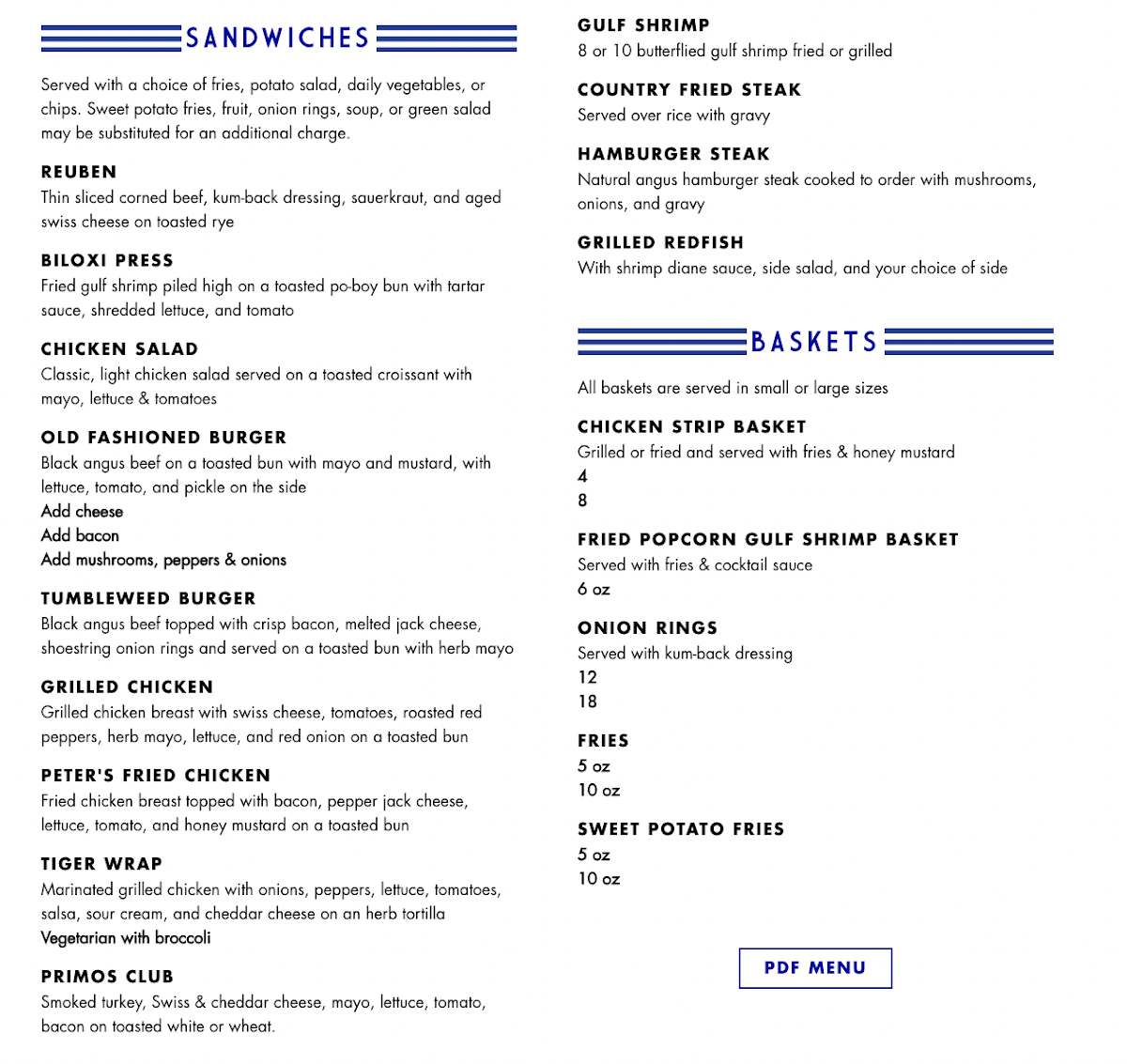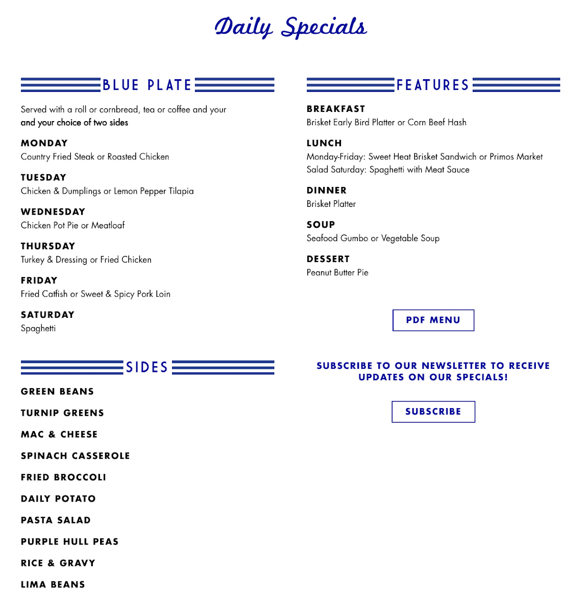 Primos Cafe is a charming diner located in Madison, MS, that delights with its hearty, all-day breakfast menu and comforting Southern classics. The breakfast plates, such as the Early Bird Platter and the flavorful Scrambler loaded with bacon, sausage, peppers, and cheese, stand out for their generous portions and homestyle flair. Health-conscious diners will appreciate the Egg White Sandwich, served on a toasted whole wheat English muffin or biscuit. Beyond breakfast, Primos serves satisfying daily specials like turkey and dressing or fried chicken, accompanied by fresh sides like vegetable soup, seafood gumbo, and creamy potato salad. The wholesome desserts and unlimited coffee complete the experience, creating a welcoming environment for casual meals. Though some dishes arrive cooler than ideal, the overall quality and affordability make Primos Cafe a dependable spot for classic, comforting fare with a Southern touch.